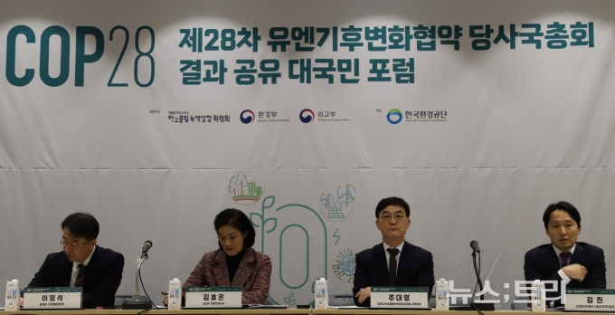 18일 서울 강남구 코엑스에서 열린 'COP28 결과공유 대국민 포럼' 기자회견에서 외교부 김효은 기후변화대사는 "산유국을 끌어들이지 않고 기후변화 대응을 효과적으로 할 수 없는데, COP28 합의문에 '화석연료'가 들어간 것은 큰 진전"이라고 밝혔다.