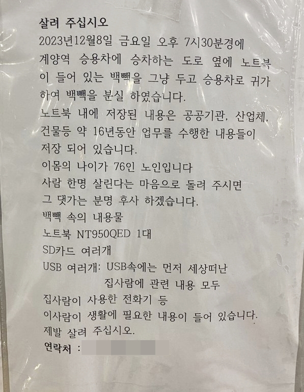종이에는 연락처와 함께 "12월 8일 계양역 도로 옆에 노트북이 든 백팩을 그냥 두고 승용차로 귀가해 가방을 분실했다"며 "사람 한 명 살린다는 마음으로 돌려주시면 분명 후사하겠다"는 글이 담겼다.