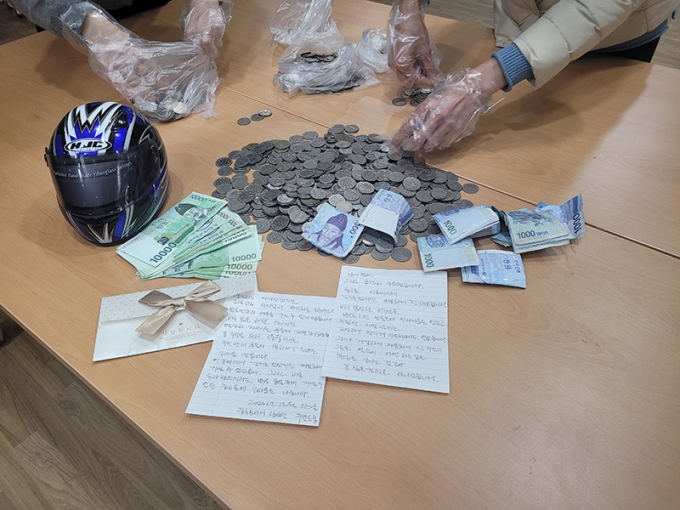 겉봉에 '사랑합니다'라고 인쇄된 봉투에는 2장 분량의 손편지와 함께 현금 10만원이, 헬멧 모양 저금통에는 총 25만6170원이 들어 있었다. 총 35만원 이상의 적지 않은 금액이다.