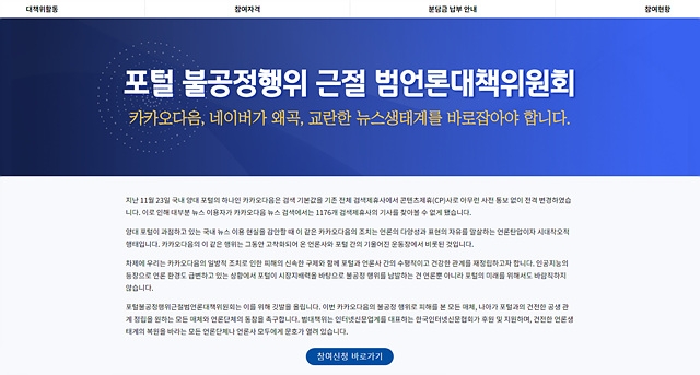 국내 뉴스생태계의 '슈퍼갑'인 카카오다음과 네이버의 불공정 행위를 근절하기 위한 '포털 불공정행위근절 범언론대책위원회'(이하 범언론대책위)가 홈페이지를 개설하고 본격적인 활동에 들어간다고 26일 밝혔다.