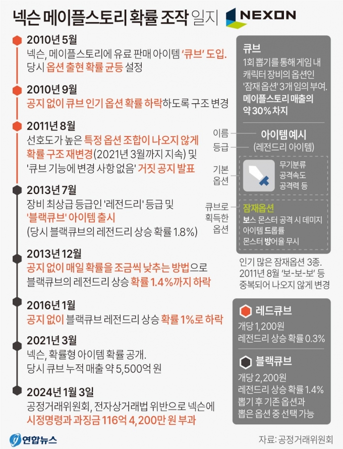 공정위 조사에 따르면 '큐브'는 출시 직후 메이플스토리 전체 매출액의 30%에 달하는 최대 수익 아이템으로 자리잡았고, 이에 넥슨은 같은 해 9월 이용자가 선호하는 인기 옵션이 나올 확률을 줄이는 식으로 확률 구조를 변경했다. 이후 2011년 8월부터는 선호도가 가장 높은 능력이 중복되는 보보보(보스 추가데미지X3), 방방방(방어율 무시X3)과 같은 특정옵션이 나올 수 없도록 바꿨다. 그러면서 "변경사항이 없으며, (확률은) 기존과 동일하게 설정된다"라고 공지했고 이로 인해 이용자들은 나오지도 않을 최상위 옵션을 위해 과도한 금액을 소비했다. 한 이용자는 큐브 구매로만 1년간 2억8000만원을 쓰기도 했다.