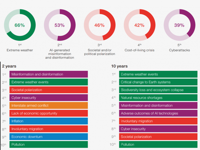 '극한기후' 다음으로 당면한 올해의 리스크는 '인공지능(AI)에 기반한 허위정보'(53%), '사회·정치적 양극화'(46%), '생계비 위기'(42%), 사이버공격(39%) 등이 꼽혔다.