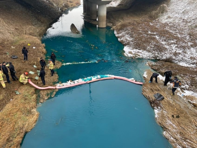 다행히 소하천에서 인근 밭이나 논 등으로 연결되는 수문 10여개를 조기 폐쇄한 덕분에 인접 지역으로 흘러든 오염수 양은 거의 없는 것으로 파악됐다. 소방당국은 오염 구간이 길게 퍼져 있어 방제 완료까지 몇주는 더 걸릴 것으로 내다봤다.