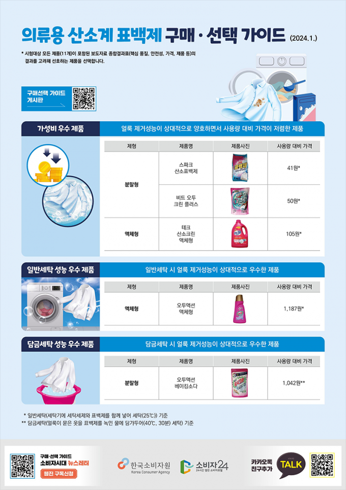 16일 한국소비자원은 의류용 산소계 표백제 11개 제품(분말형 8개 제품, 액체형 3개 제품)을 대상으로 성능과 안전성 등을 시험한 결과, 가성비가 가장 높은 제품은 애경산업의 '스파크 산소 표백제' 등 3종이었고, 일반세탁시 얼룩제거 성능이 가장 좋은 제품은 옥시크린의 '오투액션 액체형'인 것으로 나타났다고 밝혔다.