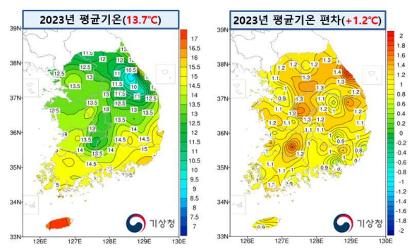 기상청이 16일 발표한 '2023년 연 기후분석 결과'에 따르면, 우리나라에서 2023년은 1973년 기상관측이 시작된 이해 51년만에 가장 더운 해로 기록됐다. 지난해 우리나라 연평균 기온은 13.7℃였다. 이는 예년에 비해 1.2℃ 높은 수치고, 종전에 가장 더웠던 2016년과 비교하면 0.3℃ 더 높았다.
