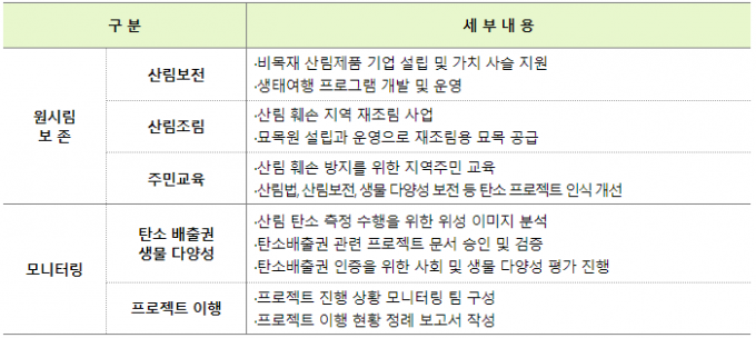 아울러 사업기간 중 발행하는 '탄소 크레딧'(Carbon Credit) 판매 수익금 전액을 해당 사업에 재투자해 산림경영의 선순환 구조를 이행한다는 방침이다.