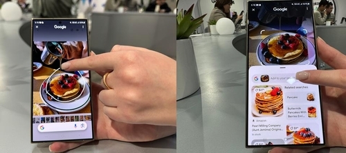 '서클 투 서치' 기능은 이미지에서 동그라미를 그리면 AI가 알아서 검색 결과를 내놓는 것이다. 일례로 팬케이크가 있는 사진을 열고 홈버튼을 길게 누른 뒤 팬케이크에 동그라미를 그리면 잠시 후 화면 아래에 검색 결과가 나온다.