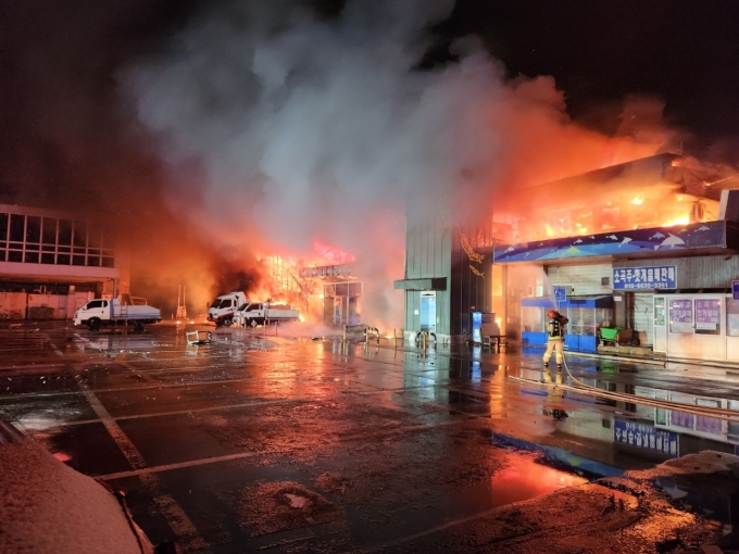 간밤에 뜬눈으로 밤을 새운 상인들은 굵은 눈발이 날리는 가운데 처참하게 타버린 점포와 시설물 앞에서 망연자실한 모습들이다. 강한 불길에 화재를 진압하는데 9시간이나 걸렸다. 설 대목을 앞두고 수천만원어치 쟁여놨던 건어물은 밤새 재로 사라지고 매케한 연기만 남았다.