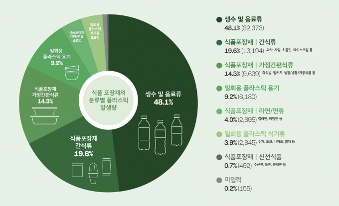 식품포장재 가운데서도 '생수 및 음료류'가 48.1%로 절반 가까이를 차지했다. '생수 및 음료수'는 전체 일회용 플라스틱 폐기물에서 37.6% 비중으로 매우 높게 나왔다. 버려지는 일회용 플라스틱 폐기물 3개 중 1개는 음료용기인 셈이다.