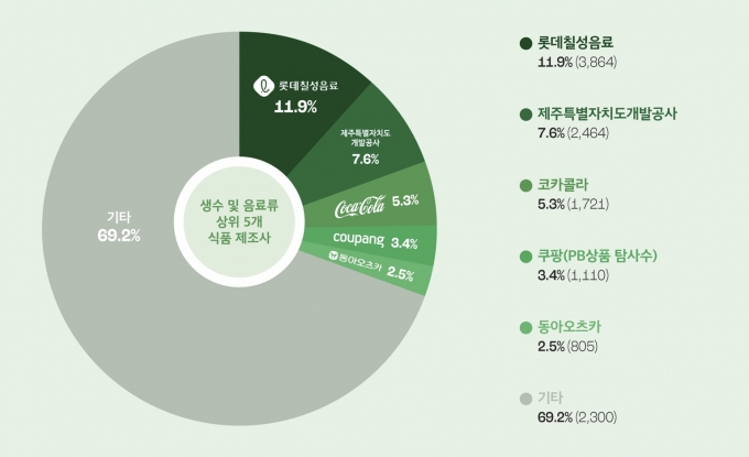 온라인 유통사 가운데 유일하게 쿠팡이 '생수 및 음료수' 최다 배출기업으로 이름을 올렸다. 쿠팡은 '탐사수'라는 PB상품으로 배출량 4위를 차지했다. 포카리스웨트를 제조하는 동아오츠카는 5위를 기록했다. 상위 5개 기업에서 배출한 생수 및 음료류 플라스틱 폐기물은 전체 생수 및 음료류 플라스틱 폐기물 3만2373개 가운데 9964개로 30.8%를 차지했다.