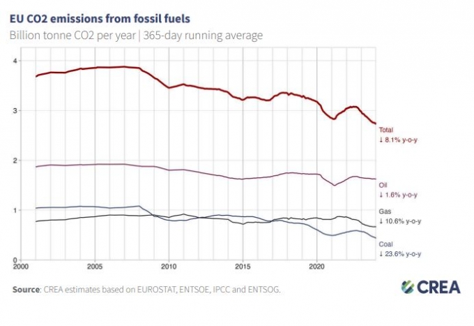 2023년 유럽연합(EU)이 화석연료에서 배출한 이산화탄소(CO2)의 양이 2022년에 비해 8% 감소해 60년만에 최저수준으로 떨어졌다.