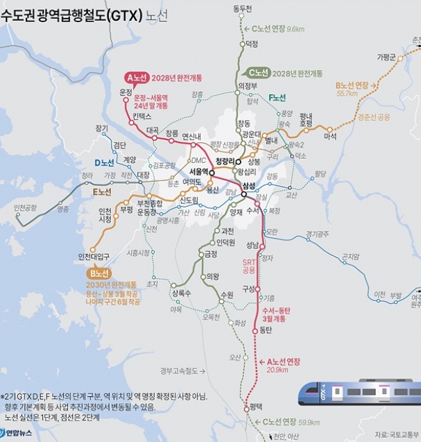 이 중 D·F노선은 2단계로 구간을 나눠 개통을 추진한다. 1단계 구간은 2035년 개통을 목표로 윤석열 정부 임기 내 예비타당성조사(예타) 동시 통과를 추진한다.