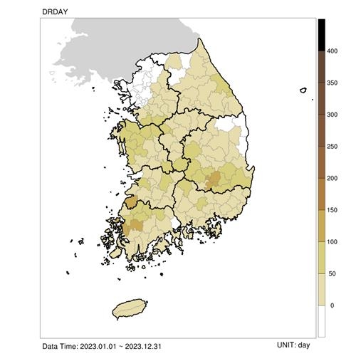 2023년 우리나라 가뭄일수는 31일이었다. 가뭄이 가장 심했던 지역은 전남을 비롯한 남부지역이었고, 중부지역은 상대적으로 가뭄일수가 적었다. 다만 한반도 가뭄현상은 기후변화로 점차 늘어나며, 지역별로도 편차가 심할 것이라는 전망이다.