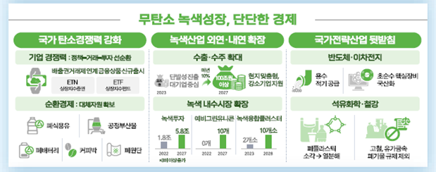 '미래성장' 분야에서는 녹색투자를 대폭 확대해 탄소중립과 순환경제를 지원한다. 먼저 녹색투자를 2022년 1조8000억원 규모에서 2024년 4조7000억원으로 확대하고, 임기내 누적 30조원을 달성한다는 계획이다. 2027년까지 그린스타트업을 385개에서 1000개로 늘리고, 이 가운데 기업가치 1000억원 이상의 그린유니콘 기업을 2027년까지 10개 육성한다는 계획이다.