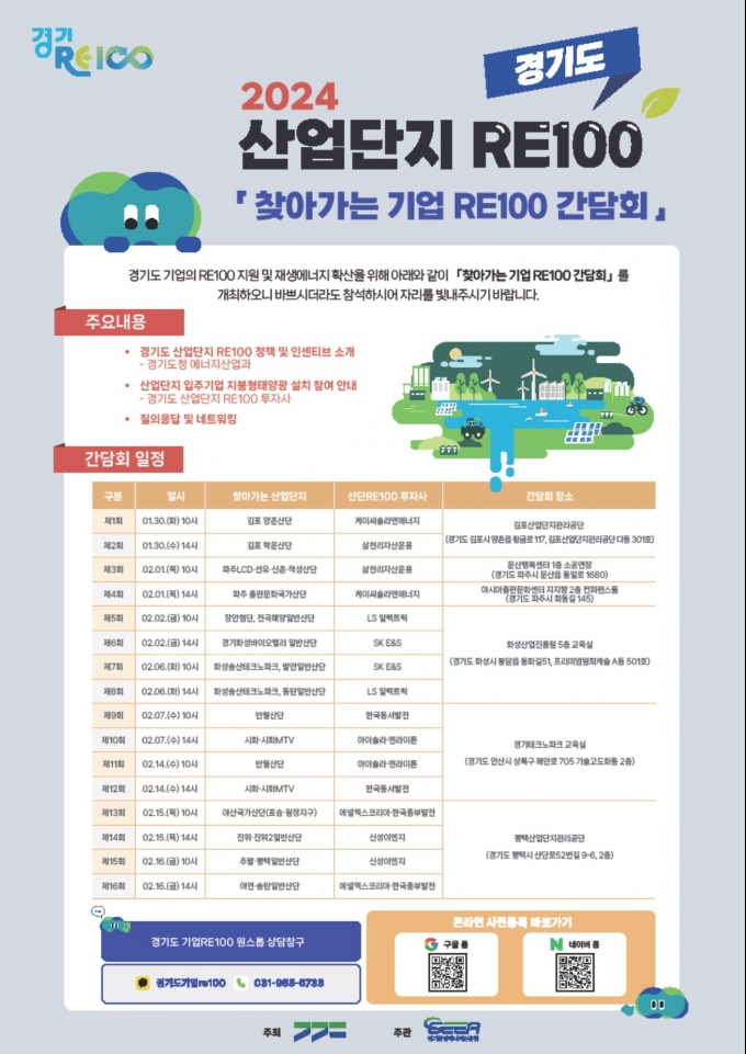 간담회는 산업단지 입주기업 외에 개별입지 기업에서도 참여할 수 있으며, 온라인 사전등록은 원스톱 상담센터인 '경기도 기업 RE100' 카카오톡 채널을 통해서도 가능하다.