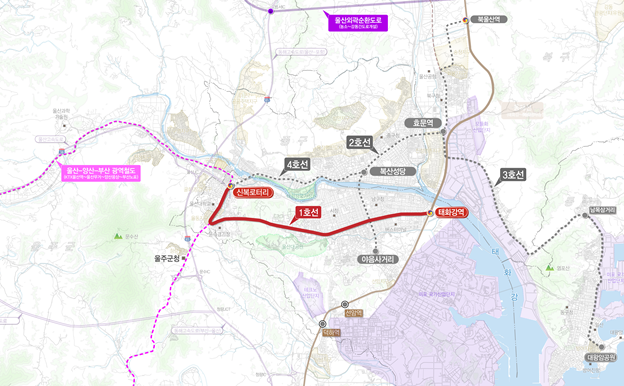 울산시는 총 사업비 3280억 원(국비 60% 1968억 원, 지방비 40% 1312억 원)을 투입해 태화강역~신복교차로 구간, 연장 11.015km 규모로 '울산 도시철도 1호선'을 오는 2026년 착공해 2029년 개통할 예정이다.