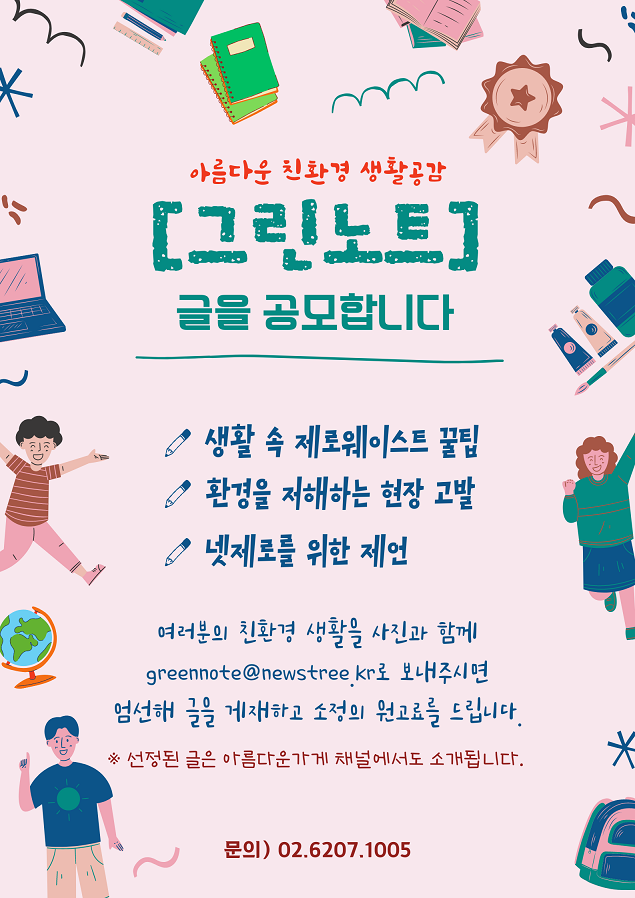 아름다운 친환경 생활공감 [그린노트]에 많은 응모 부탁드립니다. 보내주실 곳은 greennote@newstree.kr이며, 선정된 글에 대해서는 소정의 원고료로 네이버페이(4만원)가 제공되며, 게재된 글은 아름다운가게 홈페이지를 통해서도 볼 수 있습니다.