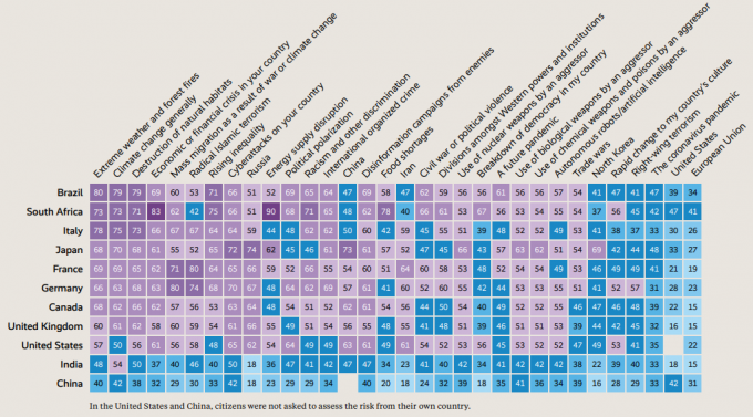 조사 결과, G7 회원국 가운데 영국과 일본을 제외한 나머지 국가들은 '기후위기'를 올해 가장 큰 안보위협으로 꼽았다. 특히 이탈리아 국민들은 기후위기를 안보위협으로 체감하는 정도가 가장 높았다. 이탈리아의 경우 '극한기후 및 산불', '기후변화 전반', '생태계 파괴' 평가지수가 각각 78점, 75점, 73점으로 안보위협의 1~3위를 기후위기 관련 항목이 차지했다.
