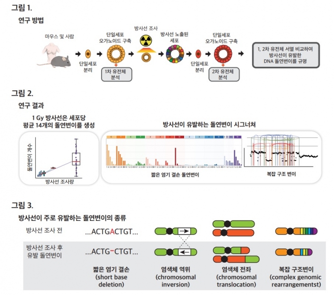 연구진은 생쥐와 사람의 여러 장기 세포를 다양한 선량의 방사선에 노출시키고 오가노이드 세포 배양 기술로 증폭시켜 돌연변이를 정밀 검출했다. 이렇게 해서 총 200개의 세포 유전체 서열로부터 방사선 피폭 양에 따른 특정 돌연변이를 규명했다.