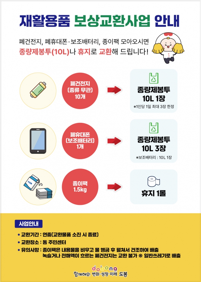 서울 도봉구 주민들은 종이팩, 폐휴대폰, 보조배터리, 폐건전지 등을 동주민센터로 가져가면 종량제봉투나 휴재 등으로 바꿀 수 있다.
