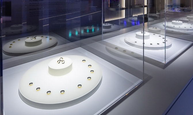 '갤럭시 링'은 블랙·골드·실버 3가지 색상, 총 9개의 사이즈로 전시되며, 관람객들은 실물을 눈으로 확인할 수 있다.