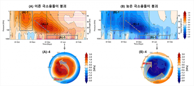 극지연구소 김성중 박사 연구팀은 부경대학교 김백민 교수, 서울대학교 권하택 박사 연구팀과 공동으로 1979년부터 2022년까지 남극 극소용돌이의 붕괴 시기와 남극 온난화 발생 강도를 분석해 상관관계를 찾아냈다.