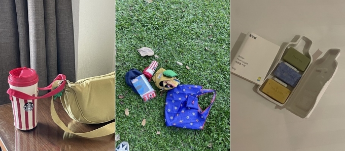 세번째로 여행 필수용품으로 텀블러와 다회용 빨대, 장바구니, 제로웨이스트 여행용 비누세트(샴푸바,린스바, 바디워시바)를 챙겨갔다. 용기를 가져가지 않은 이유는 도시락 통을 현지에서 구매할 예정이었기 때문이다. 약간은 걱정하며 '혹시 텀블러에 음료를 줄 수 있나요? 빨대없이요!'라던지, '혹시 남은 음식을 여기에 가져가도 되나요?'라고 조마조마하게 물을 때마다 '당연하죠!'라는 반응과 텀블러 할인까지 해주는 매장에 갔을 때는 기분이 정말 '째질듯이' 좋았다. 여행을 하며 찍힌 사진 곳곳에 좋아하는 친구가 준 텀블러와 함께 찍힌 사진이 지금도 기분을 좋게 한다. 장바구니를 들고 다니다가 공원에서 펼치고 앉아 일몰을 감상하기도 했다. 여행용 비누세트는 숙소에 대부분 비치돼 있는 대용량 어메니티를 사용하는 바람에 린스바만 썼지만, 그래도 최소한 샤워를 할 때 쓰레기를 남기지 않고 왔다는데 만족했다.