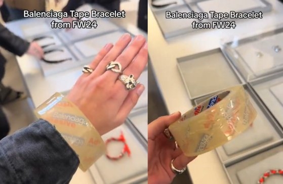 14일 업계에 따르면 발렌시아가는 지난 5일(현지시간) 파리 패션위크에서 열린 2024 가을/겨울(F/W) 컬렉션에서 '테이프 팔찌'를 선보였다.