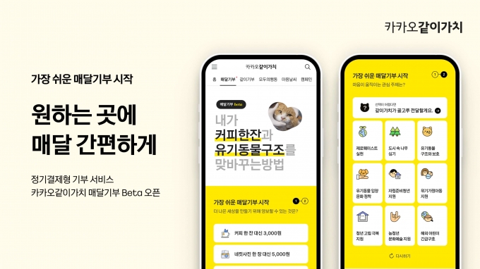 카카오의 사회공헌 플랫폼 '카카오같이가치'는 이용자가 후원하고 싶은 분야의 기부 항목과 희망하는 기부 금액을 선택해, 매월 정기 기부에 참여할 수 있는 '매달기부'를 베타 서비스로 오픈했다고 15일 밝혔다.