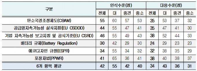 기업 규모별로 ESG 수출규제에 대한 인식과 대응수준의 차이를 보였다. 대기업은 55점인 반면 중소기업은 40점으로 나왔다. 대응수준도 대기업은 43점, 중소기업은 31점으로 나타나 중소기업이 대기업에 비해 상대적으로 ESG 수출규제에 대해 잘 모르고 있고, 대응노력도 부족한 것으로 분석됐다.