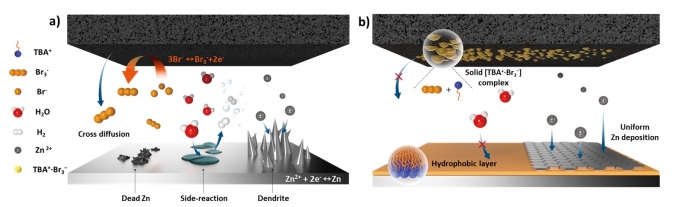연구팀이 개발한 전해질은 음극의 경우, 아연 금속 표면에 물의 부반응을 막을 수 있는 소수성 보호층을 형성해 덴드라이트 형성을 억제했다. 양극에서는 브롬의 상변화를 통해 교차확산이 억제되는 것이 확인됐고, 이로 인해 셀의 자가 방전을 억제하는 데도 성공했다.