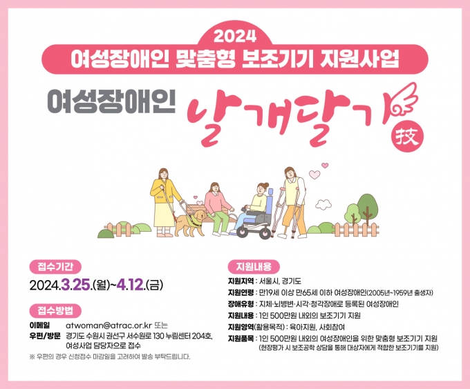 여성장애인 날개달기 사업 지원자로 선정되면 경기도재활공학서비스연구지원센터 소속 보조공학 전문가의 상담을 거쳐서 맞춤형 보조기기를 지원받는다. 이후 사용 및 관리 교육, 사후 관리 서비스를 받을 수 있는 점도 이번 사업의 장점이다.