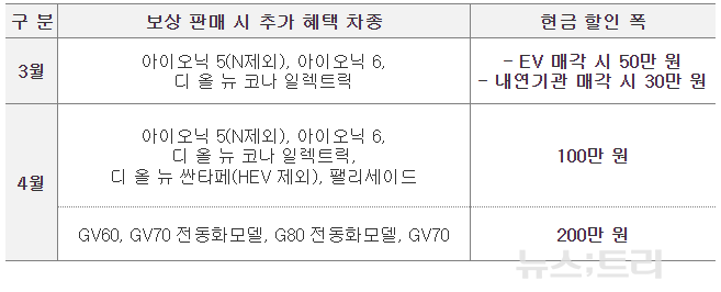 현대차가 4월에 '트레이드-인' 보상판매 대상기종을 확대한 것은 3월 실시한 '트레이드-인' 보상판매 덕분에 전기차 판매량이 전월대비 800% 급증한데 따른 것이다.