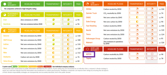 9일(현지시간) 독일 비영리단체 신기후연구소와 탄소시장감시는 자동차 제조, 전력발전, 패션, 식품 등 4개 분야 연매출 상위 20개 기업의 기후정책을 평가한 '2024 기업 기후책임 감시' 보고서를 발간했다. 이번 평가에 포함된 한전은 5개 평가등급 가운데 가장 낮은 '정합성 매우 낮음'(very low integrity) 등급을 받았다.