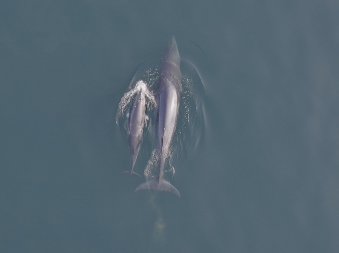 밍크고래 3마리 가운데 2마리는 어미와 새끼로 확인됐다. 이에 수과원 조사팀은 어미 밍크고래와 새끼 밍크고래의 이동 모습을 드론으로 촬영했다. 영상에는 새끼고래가 품에 붙었다 떨어지기를 반복하며 어미를 따라가는 모습이 담겨있다.