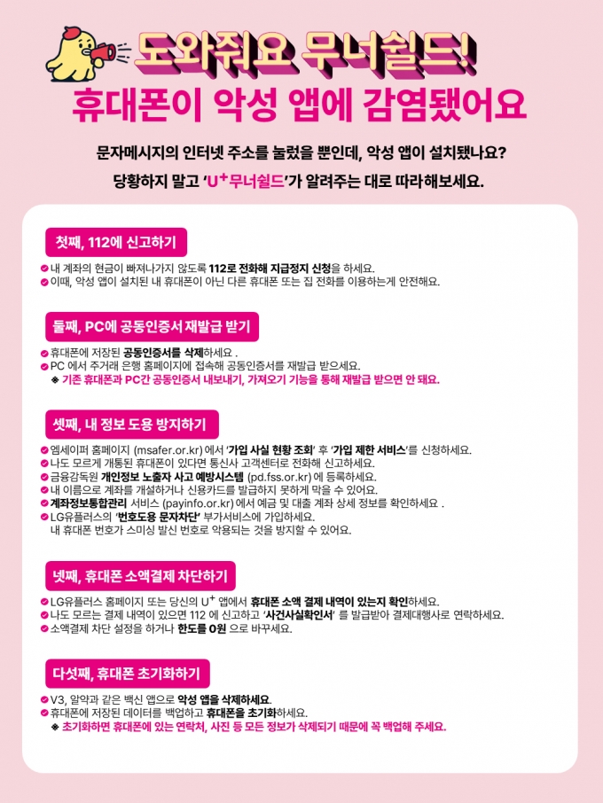 LG유플러스는 캠페인의 첫번째로 스미싱 문자를 통한 악성앱 감염시 행동요령을 소개했다. 악성앱 감염시 경찰청 전기통신금융사기 통합신고대응센터(국번없이 112)에 연락해 '계좌 지급정지'를 요청하고, 휴대전화에 저장된 공동인증서가 악용되지 않도록 PC에서 주거래은행의 홈페이지에 접속해 새로운 공동인증서를 재발급해야 한다고 밝혔다.