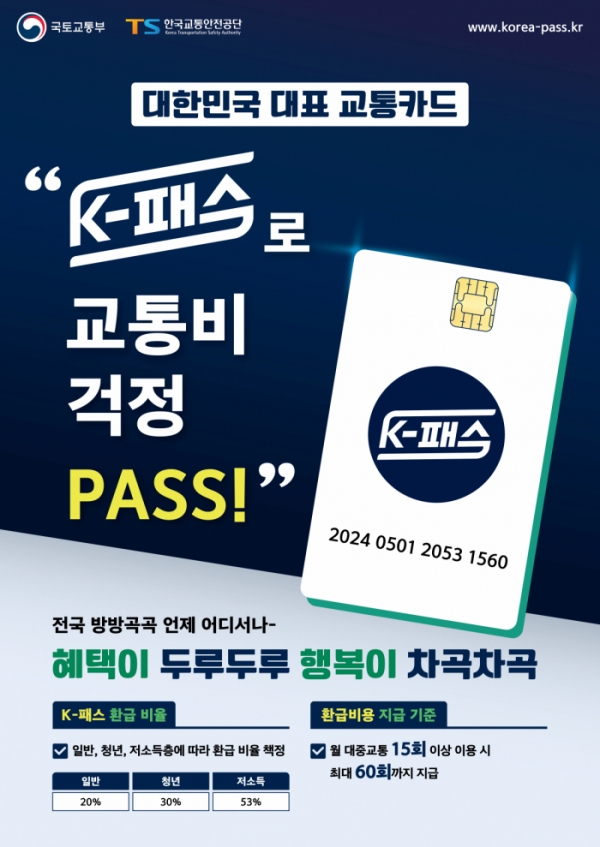 환급률은 일반인 20%, 청년층 30%, 저소득층 53%로 지역제한 없이 전국 대중교통을 대상으로 적용된다. 카드사별로 카드 이용실적에 따라 추가 혜택을 제공한다. 'K-패스' 할인 혜택은 5월 1일부터 적용된다.