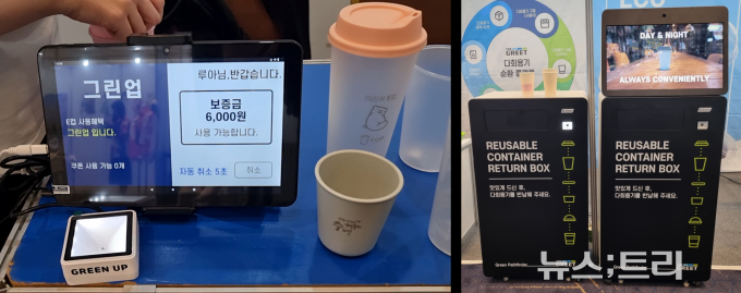 홍보부스 첫머리에는 다회용기 스타트업들이 시연을 펼치고 있었다. 먼저 스타트업 그린업의 'E컵'은 카페에서 쓸 수 있는 다회용컵이다. E컵은 QR코드가 찍혀있다는 점이 특징이다. 스마트폰 애플리케이션을 통해 E컵 제휴매장을 검색할 수 있고, 제휴매장에는 패드가 있어 카메라로 QR코드를 스캔해 다회용컵을 대여할 수 있다.