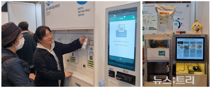 재활용을 넘어 기존 용기를 그대로 두고 알맹이만 다시 채워쓰는 '리필 스테이션' 체험장도 마련됐다. 사물인터넷(IoT) 자동리필시스템을 개발한 업체 리피래는 무독성 주방세제, 세탁세제, 섬유유연제를 뽑아내는 방식으로 판매하는 키오스크를 취급한다. 스마트폰으로 키오스크의 QR코드를 스캔한 뒤 용량을 설정해 결제하면 스마트폰 화면에서 버튼이 활성화된다. 키오스크의 사출구에 본인만의 용기를 대고 버튼을 누르면 미리 설정한 양만큼 세제나 유연제를 뽑아갈 수 있다.