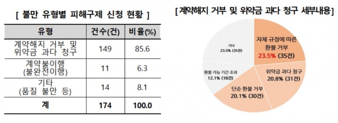 이 가운데 △사업자가 자체 규정을 이유로 '환불 불가'를 주장하거나(35건) △위약금 과다 청구(31건) △단순 환불 거부(30건) 등이 주를 이뤘다. 특히 대전 스터디카페의 37.1%가 중도 해지 시 환불이 어려운 것으로 나타났다.