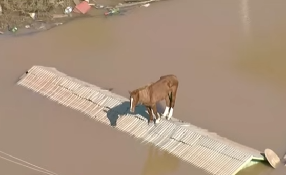 브라질 남부에서 발생한 대홍수에 지붕으로 대피했던 말이 며칠만에 간신히 구조됐다.