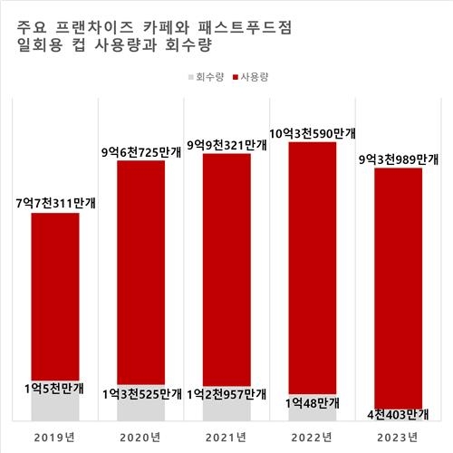 환경부와 일회용품 사용량 감축을 협약한 프랜차이즈 카페와 패스트푸드점은 지난 2023년 한해동안 일회용컵 9억3989만2000여개를 사용한 것으로 환경부가 집계했다. 이 가운데 종이컵은 약 3억8219만9000개, 플라스틱컵은 약 5억5769만4000개였다.