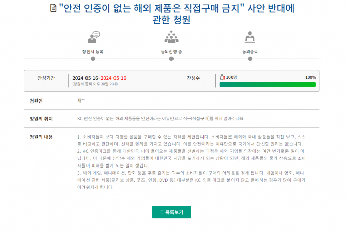 정부가 'KC인증'을 받지 않은 80개 품목의 해외 직접구매(직구)를 금지시킨데 대해 소비자들이 반발하고 나섰다. 최근 알리익스프레스와 테무 등 중국 온라인커머스를 통해 구입한 제품들의 유해성 논란이 일자, 정부가 이를 원천차단하기 위한 조치로 해석된다. 그러나 저가에 제품을 구매해왔던 소비자들은 정부의 갑작스런 직구금지에 '중간 유통업자만 배불리는 꼴'이라고 비판하며, 규제반대 청원까지 올라온 상태다.