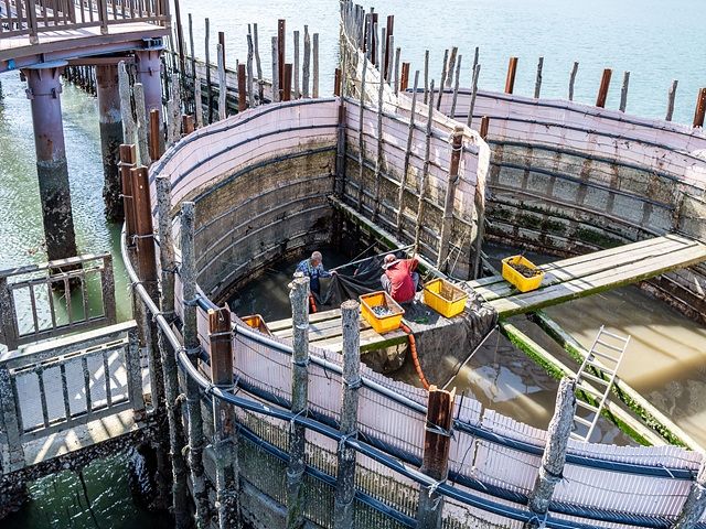▲2~3명이 분업해 작업하는 죽방렴 (사진=박산하) ◇ 하동 섬진강 재첩잡이