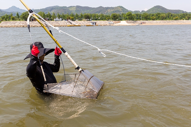 ▲손틀어업에서 중요한 거랭이. 재첩이 담긴 거랭이를 들고 있다 (사진=채지형) ◇700살 소나무...예천 천향리 석송령