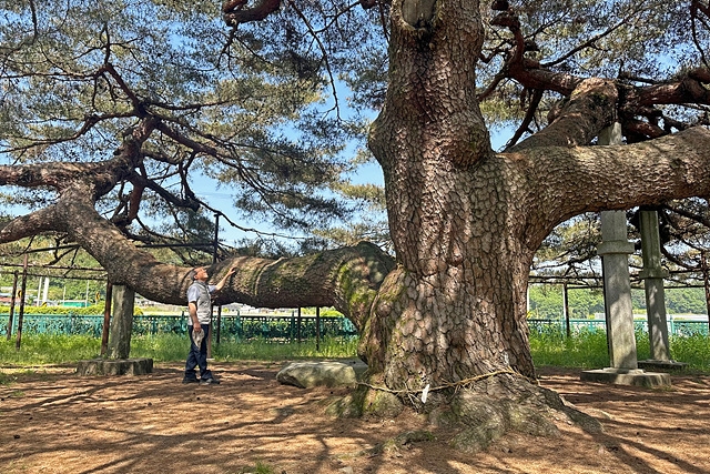 소나무 한 그루 둘러보는데 무슨 야단일까 싶지만 석송령이라면 다르다. 석송령은 추정 수령이 약 700년으로 줄기 둘레가 4.2m, 높이 11m에 이르는 고목이다. 무엇보다 반송 품종 소나무다. 반송의 반(盤)은 대야, 쟁반 등을 뜻한다. 줄기가 밑에서부터 여러 갈래로 퍼지는 형태가 특징이다. 석송령은 수관 폭이 무려 30m에 달한다. 크다는 말로는 부족하다. 멀리서 보면 소나무 한 그루가 아니라 솔숲인 듯하다.