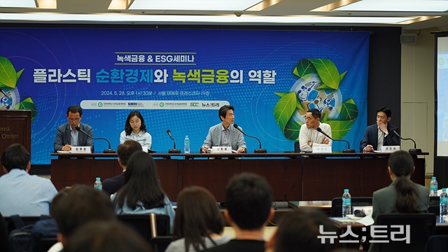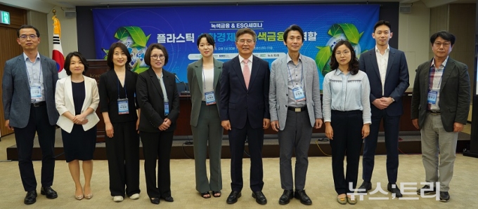 28일 서울 태평로 한국프레스센터에서 인하대학교 녹색금융대학원과 지속가능경영연구소 주최, 뉴스트리와 SDG연구소 주관으로 '플라스틱 순환경제와 녹색금융의 역할' 주제로 열린 '녹색금융&ESG세미나'에서 참석자들은 플라스틱 국제협약이 가져올 산업생태계 변화에 대응하려면 하루빨리 선형경제에서 순환경제로 전환하고, 재활용 소재를 글로벌 스탠다드에 맞춰 생산할 수 있는 구조를 마련해야 한다는데 의견을 같이했다.