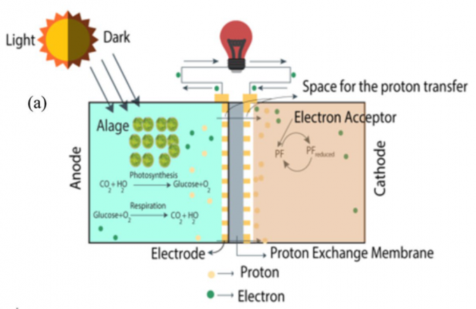 미세광합성전지는 4㎝x4㎝x4㎜의 매우 작은 크기로, 양성자 교환막을 사이에 두고 양극실과 음극실로 나뉘어져 있다. 양극실에는 녹조류가 특수용액에 담긴 채 광합성을 하고, 이 과정에서 발생하는 전자는 전자수용체인 페리시안화 칼륨으로 이뤄진 음극실로 이동하면서 전류가 발생한다.