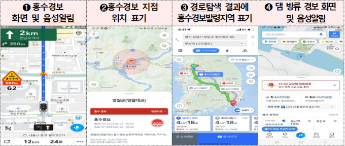 특히 올 1월부터는 과기정통부와 환경부의 주관 하에 '도로·지하차도 침수사고 예방을 위한 민·관 합동 내비게이션 고도화 특별전담반(이하 TF)'를 구성해 내비게이션 고도화를 추진해왔다. 그 결과, 7월 1일부터 내비게이션을 통한 홍수위험 실시간 알림(홍수경보 및 댐 방류 정보) 서비스 제공을 순차적으로 개시하게 됐다.