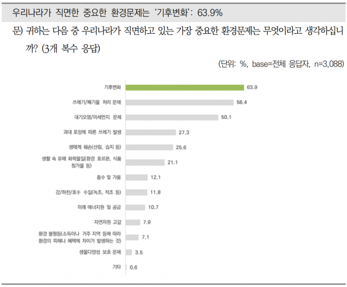 한국환경연구원(KEI)이 지난해 9월 19~69세 3088명을 대상으로 설문조사해 9일 공개한 '2023 국민환경인식조사' 보고서에 따르면 응답자의 63.9%가 '우리나라가 직면한 중요한 환경문제'라는 복수응답 질문에 '기후변화'라고 답했다. 쓰레기·폐기물 처리문제라고 답한 응답자는 58.4%였고, 대기오염·미세먼지 문제를 꼽은 응답자도 50.1%로 나왔다.